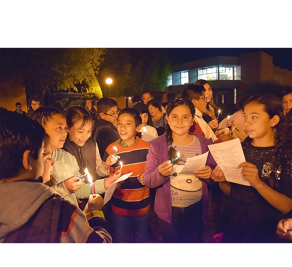 Velita en mano, los invitados de honor, niños y padres atendidos en el Centro Educativo de Servicios a la Comunidad CESCOM, entonaron los cantos para pedir posada a la entrada del Aula Magna San Ignacio.