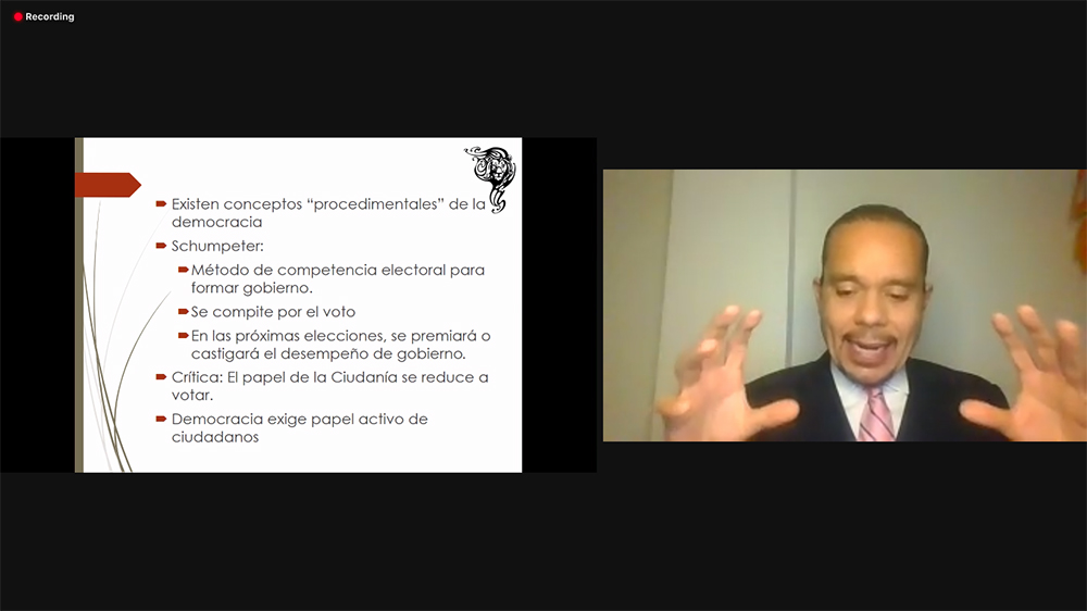 El catedrático planteó que tendencias actuales en la materia apuntan a que la democracia son las decisiones de la mayoría pero limitadas por la minoría, es decir, con el contrapeso de éstas. Además, implica una participación activa en política de la ciudadanía y no cada tres o seis años.