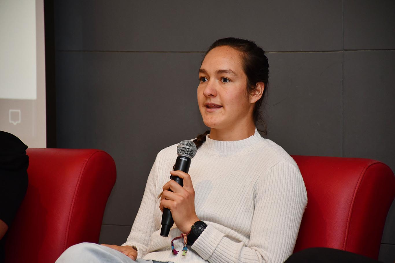 Ana Sofía, quien ha destacado en competencias nacionales e internacionales de atletismo, explicó cómo ha logrado compaginar una diversidad de actividades con sus compromisos académicos. “Si no entrenas un día realmente te repercute, y no solo en la competencia, sino en ti mismo. El deporte es algo super honesto (…) En el atletismo, en la música, en el arte es muy importante escuchar al otro. Es tan importante lo que tú haces como lo que hacen los demás. Esto mismo lo veo en mi equipo de atletismo, en la escuela también; la disposición que tenga uno es lo que puede ayudar a los demás y a uno mismo a seguir creciendo”.