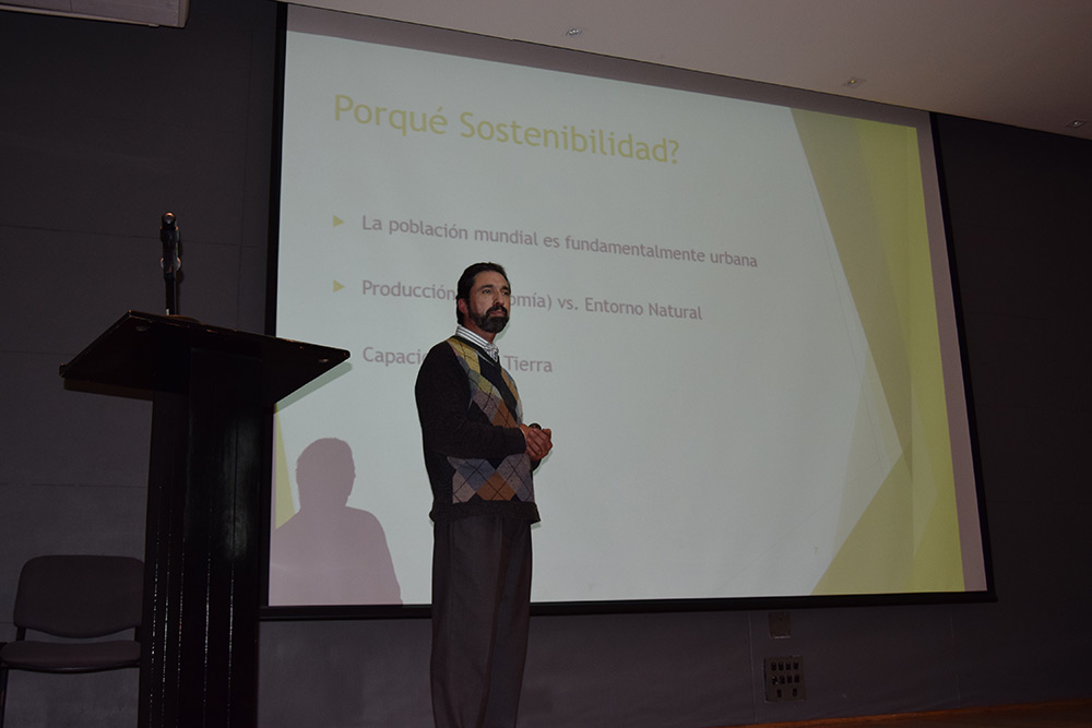 La charla corrió a cargo del Doctor en ingeniería civil, León F. Gay Alanís, quien comenzó por señalar que la sustentabilidad tiene tres pilares que deben estar en balance: el interés económico, el social y el ambiental. Los tres deben estar equilibrados.