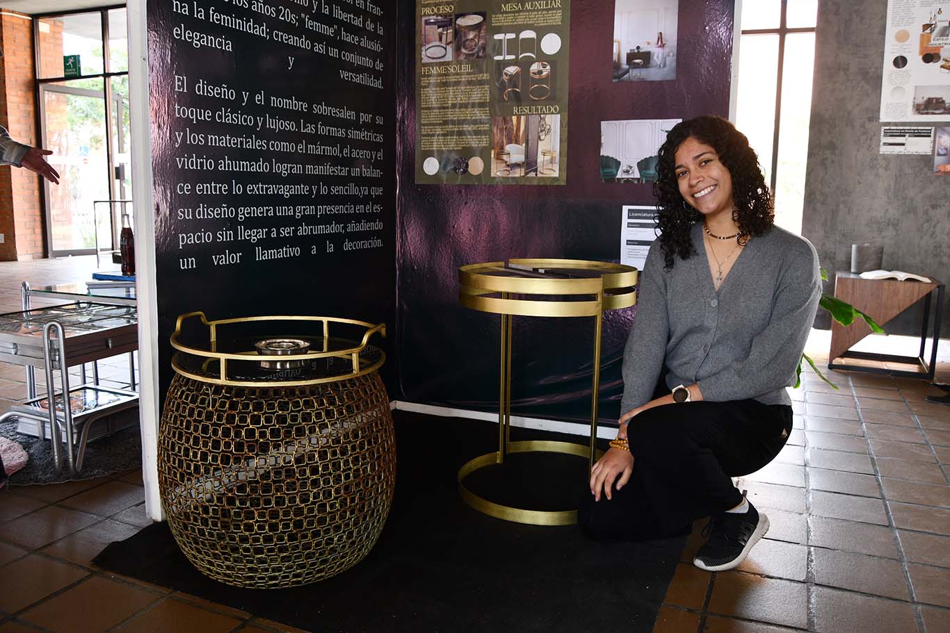 “Nos tocó el estilo Art Deco que es de 1920-1930, se caracteriza mucho por la elegancia, lo lujoso. Tiene muchos detalles dorados, negros, entonces, quisimos abstraer eso a partir de una investigación previa para poder extraer esos conceptos tan característicos. Hicimos una mesa auxiliar redonda que se compone de dos piezas, es como un circulo partido a la mitad que se puede unir y hacer una mesa más grande, también tiene una charola. Nos gustó mucho este tipo de proyectos porque no fue nuestro propio concepto el que elegimos, nos obligó a investigar y a buscar maneras de solucionar o abstraer ese estilo. Fue muy enriquecedor” – Jimena Arreola Lerma.