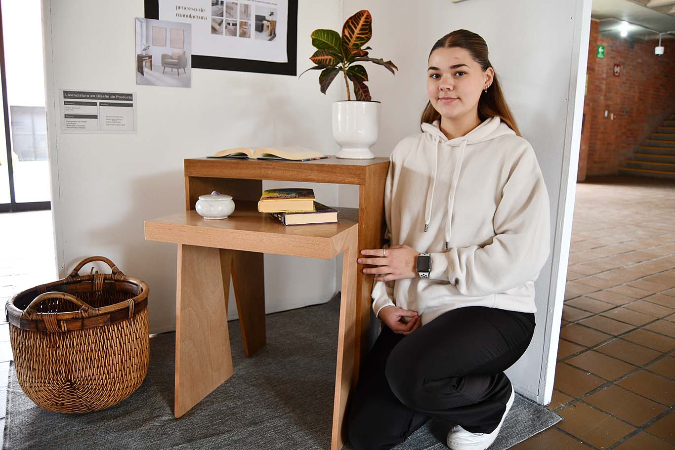 “Me tocó Japandi, que es muy sobrio con acabados de madera muy claritos. Usamos MDF en chapado con okume y el mayor reto fue la estructura porque era muy frágil, tuvimos que cambiar el diseño para que tuviera más resistencia. El mayor aprendizaje fue trabajar con más gente, tú tienes tu idea y diseño pero tienes que explicarlo a alguien para que lo plasmen en un producto. Tuvimos que ir muchas veces con el carpintero para modificar la idea y la estructura, eso fue lo más difícil” – Sabrina Bayod Orozco.