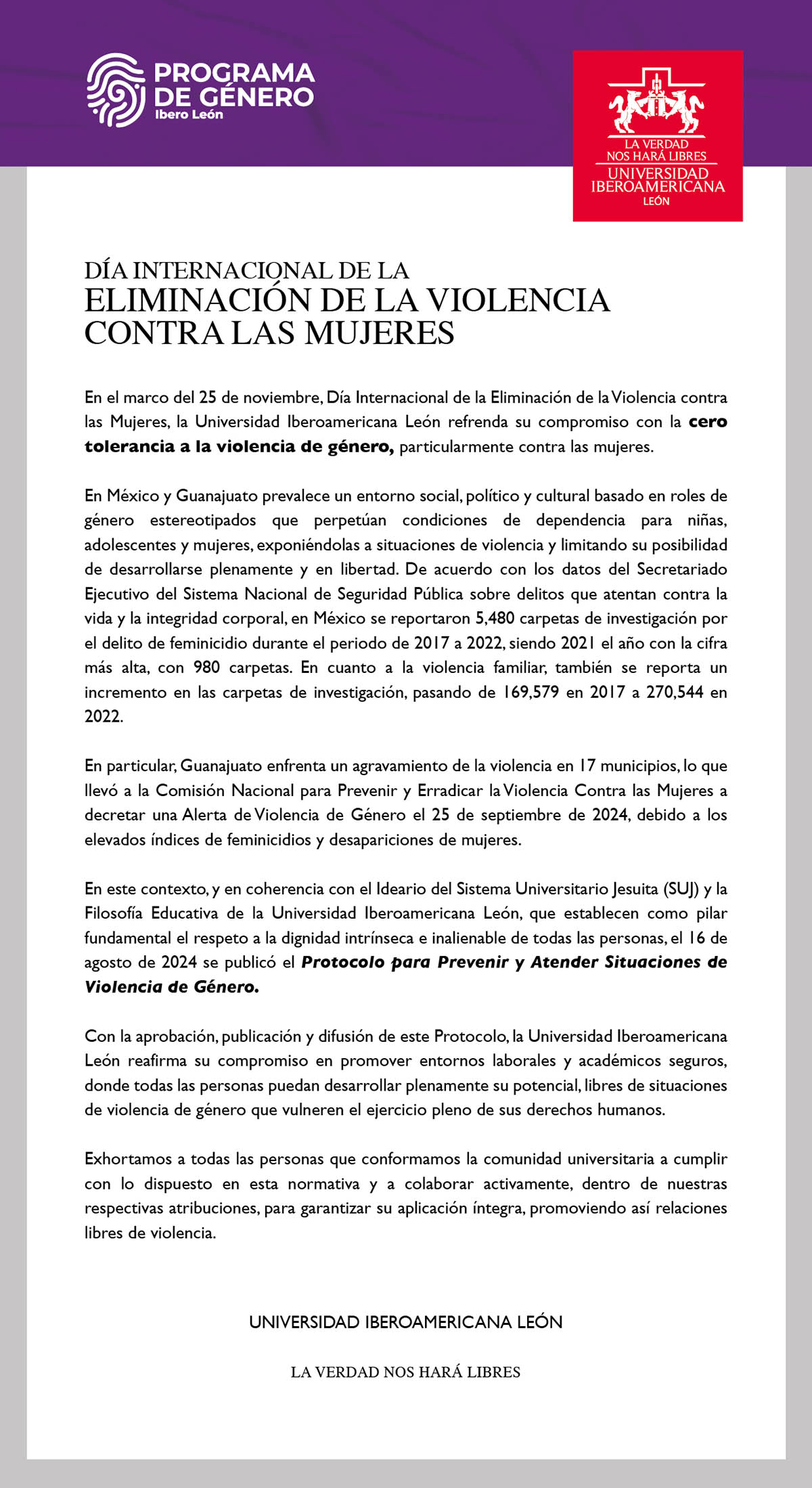 Comunicado: Día internacional de la eliminación de la violencia contra las Mujeres