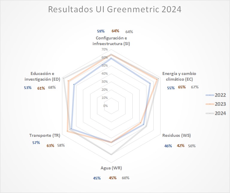 Se consideraron más de 50 indicadores catalogados en 6 áreas: Configuración e infraestructura, Energía y cambio climático, Residuos, Agua, Transporte, Educación e investigación. Prácticamente en todas las secciones, la Ibero León ha mejorado su puntaje, tal es el caso de Educación e investigación, donde se ha mantenido un avance constante: 53%, en 2022; 61%, en 2023; y 68%, en 2024.
