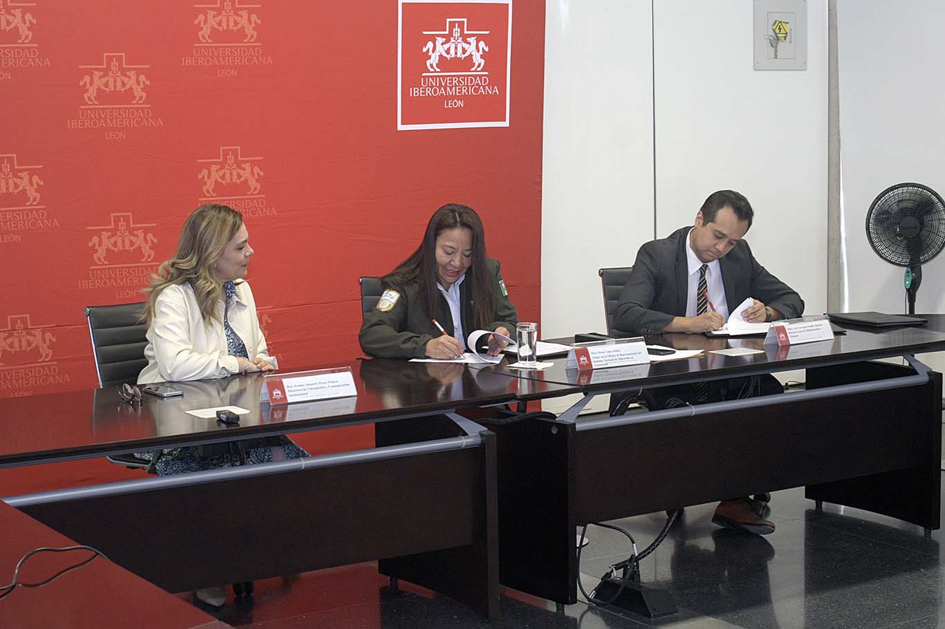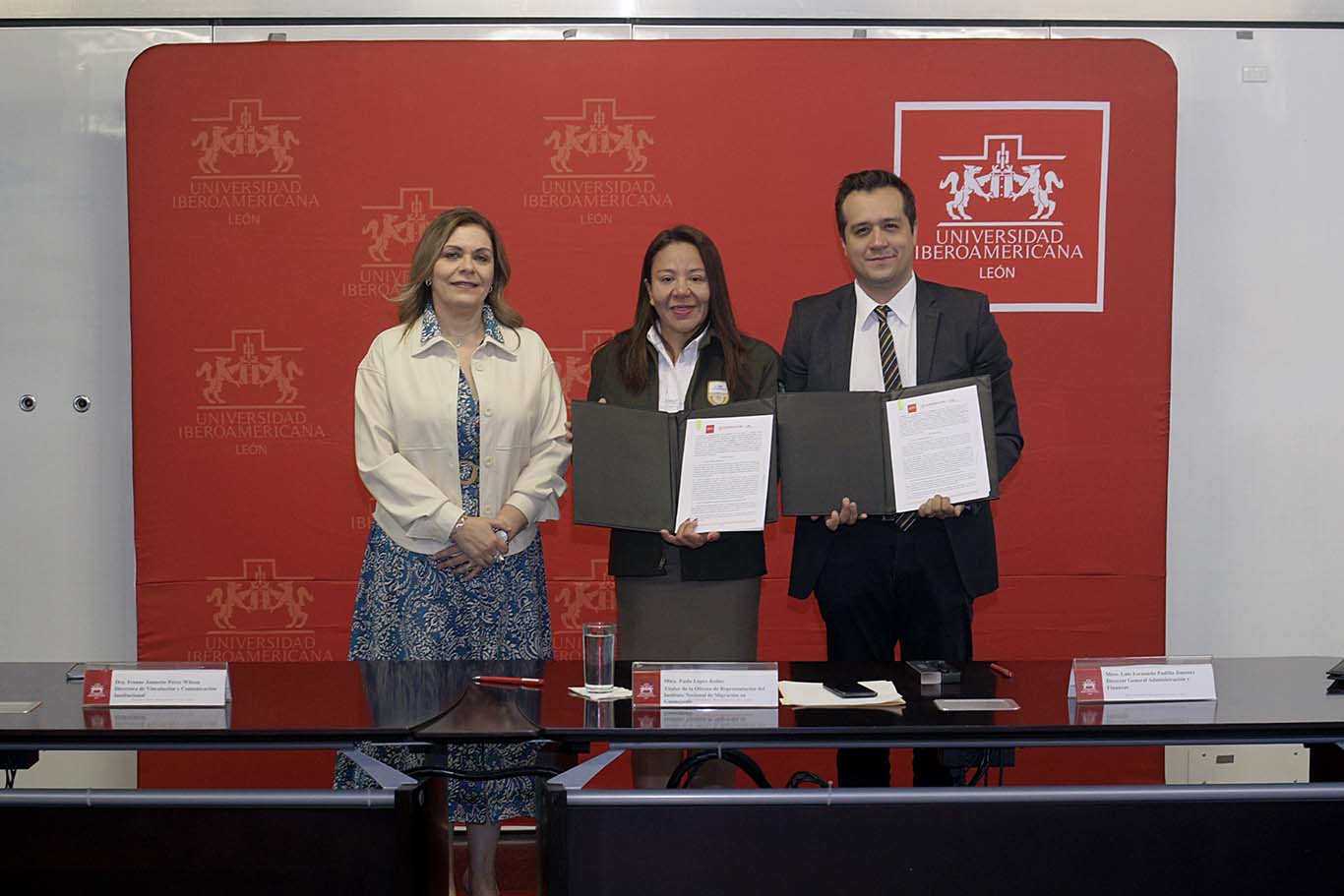 La firma del convenio fue encabezada por la titular de la Oficina de Representación del INM en Guanajuato, la Mtra. Paola López Rodas; y por parte de la Ibero León, el Dr. Luis Fernando Padilla Jiménez, director general de Administración y Finanzas; y la Dra. Ivonne Jannette Pérez Wilson, directora de Vinculación y Comunicación Institucional.