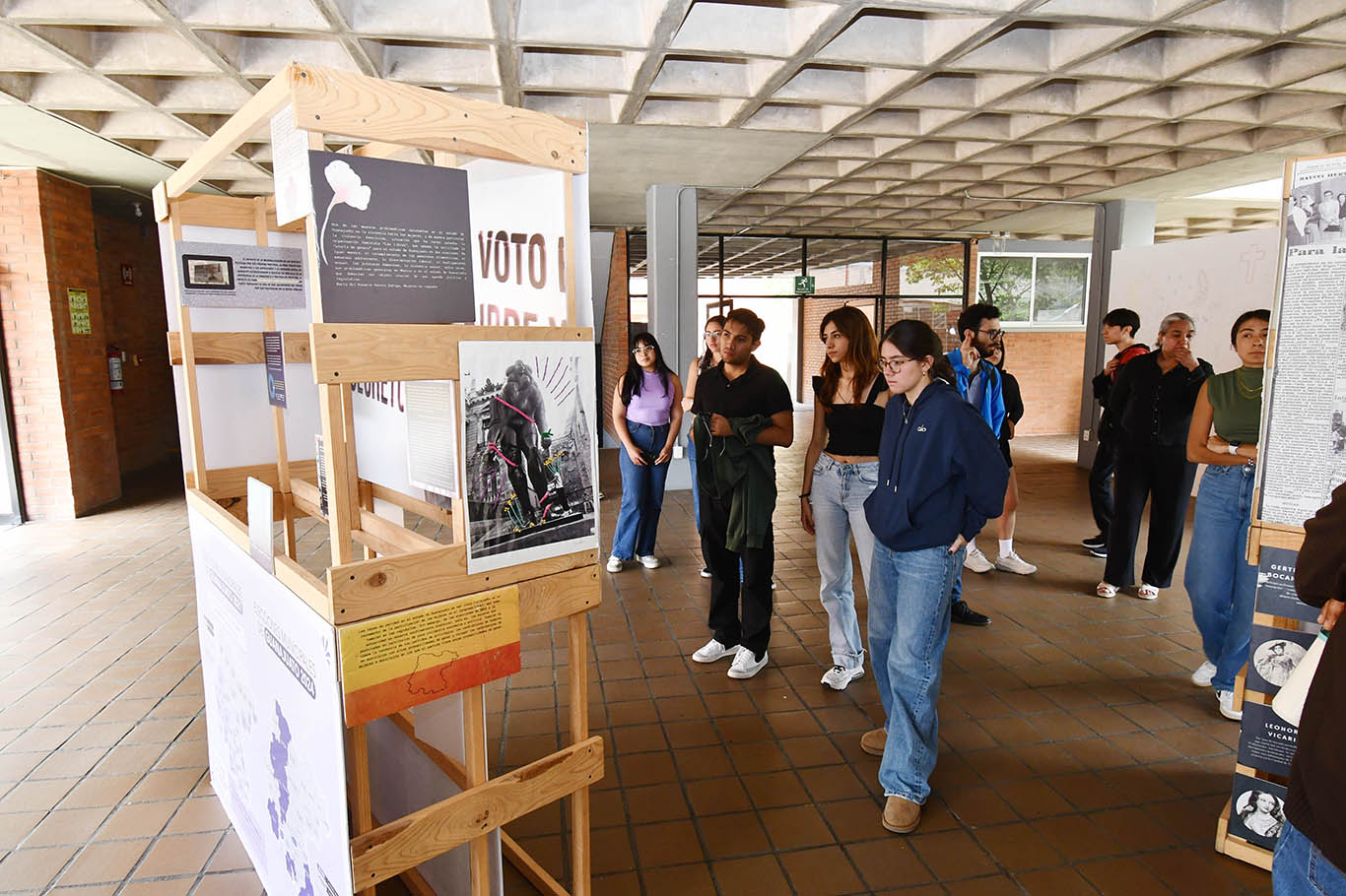 La muestra se compone de seis mamparas con imágenes que proyectan frases, momentos históricos, líneas de tiempo y retratos de mujeres que han antecedido y de las que continúan en la lucha por el reconocimiento de los derechos humanos.