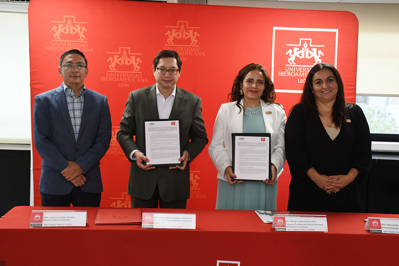 La firma del convenio se celebró en la sala Ignacio Ellacuría S.J. el jueves 11 de septiembre. Presidieron el evento la Mtra. Brenda Canchola Elizarrarraz, consejera presidenta del IEEG; la Mtra. Indira Rodríguez Ramírez, secretaria ejecutiva del IEEG; y, por parte de la Ibero León, el rector, Mtro. Luis Alfonso González Valencia S. J.; y el director general académico, Mtro. Gustavo Alejandro González Ramírez.