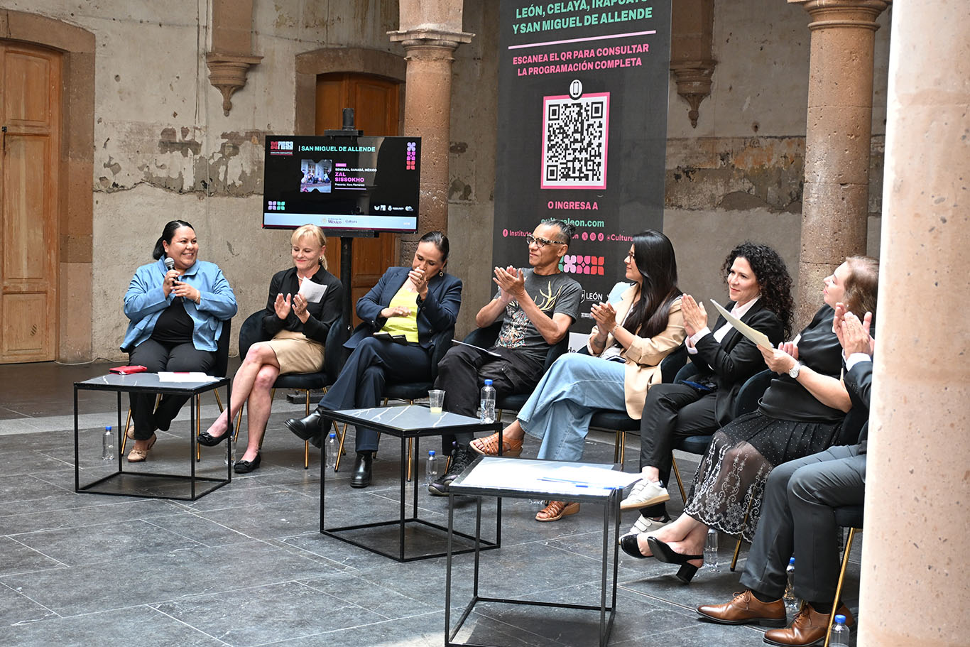 La coordinadora del Centro de Cultura de la Ibero León, Lic. María de los Ángeles Suárez Tacotalpan (extremo izquierdo), participó en la rueda de prensa con motivo de la presentación del programa del Circuito Cervantino.