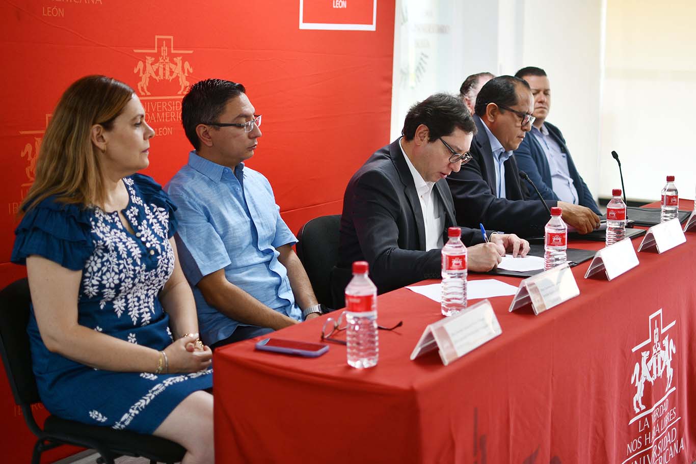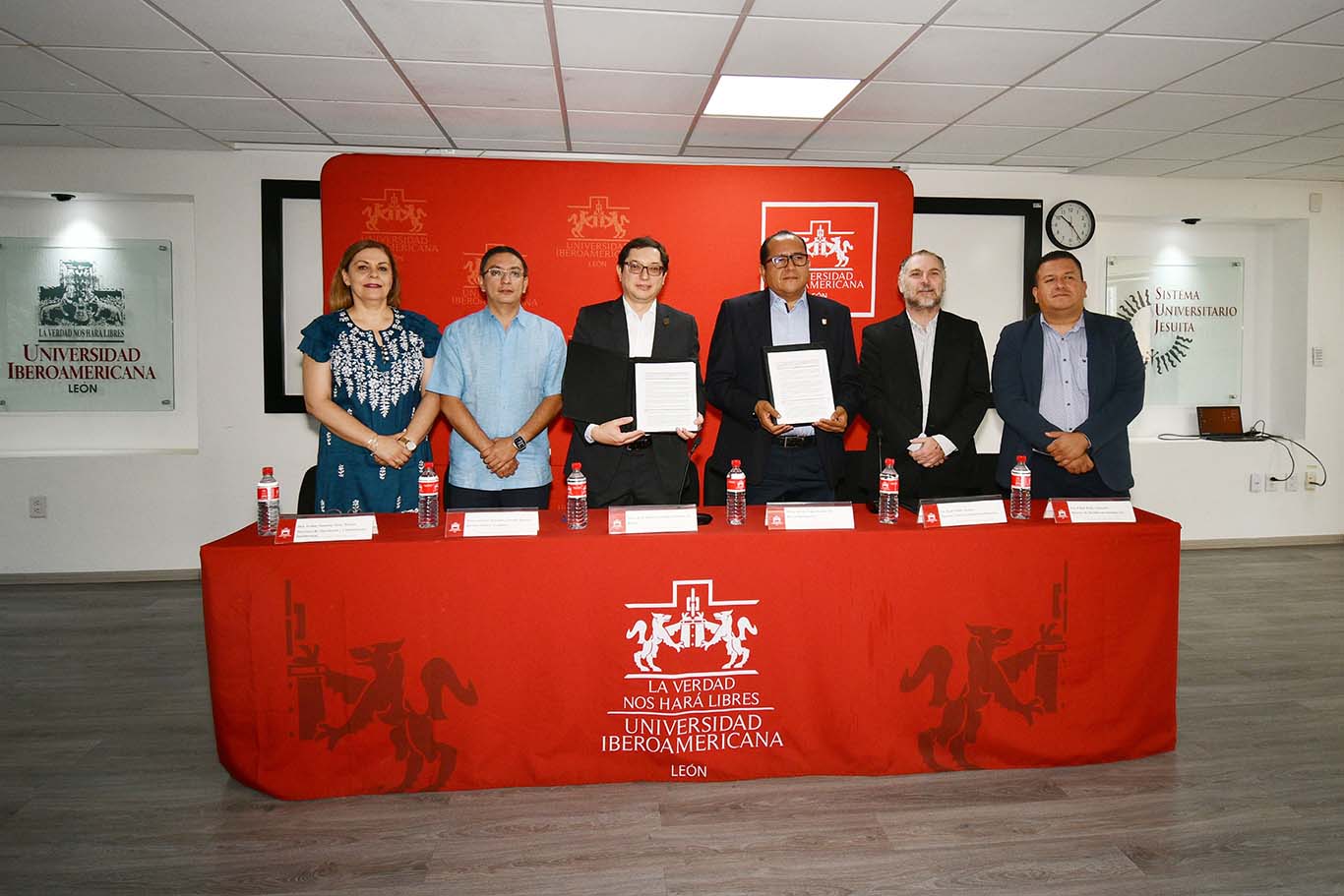 Dra. Ivonne Jannette Pérez Wilson, directora de Vinculación y Comunicación Institucional (Ibero León); Mtro. Gustavo Alejandro González Ramírez, director general Académico (Ibero León); Mtro. Luis Alfonso González Valencia SJ, rector de la Ibero León; Mtro. Aristeo López Larios S.J., rector del Instituto Lux; Lic. Raúl Padilla Medina, director general Académico (Instituto Lux), Lic. Édgar Rojas Guerrero, director de Bachillerato.