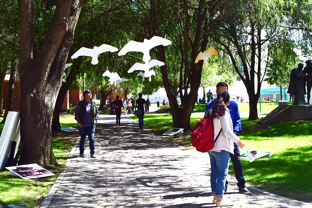 "Salir del aula permitió a los alumnos aprender, mirar, cuestionarse y reflexionar sobre su quehacer como universitarios y el sentido social de su profesión, motivándoles a soñar y querer trabajar por un mundo más justo y fraterno. El reto es inspirarnos, confrontarnos, contagiarnos y movernos", introduce la exposición, la cual estuvo reforzada por comentarios que pendieron de las copas de los árboles impresos sobre palomas de papel.