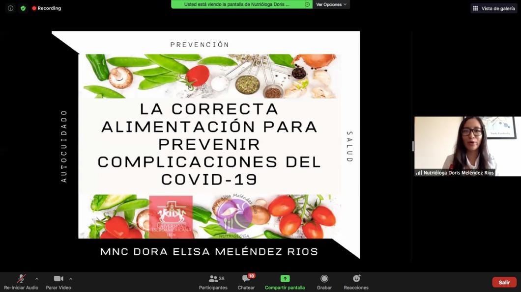 "La correcta alimentación para prevenir complicaciones del Covid 19", fue el tema presentado por la egresada de la Ibero León Dora Elisa Meléndez Ríos.
