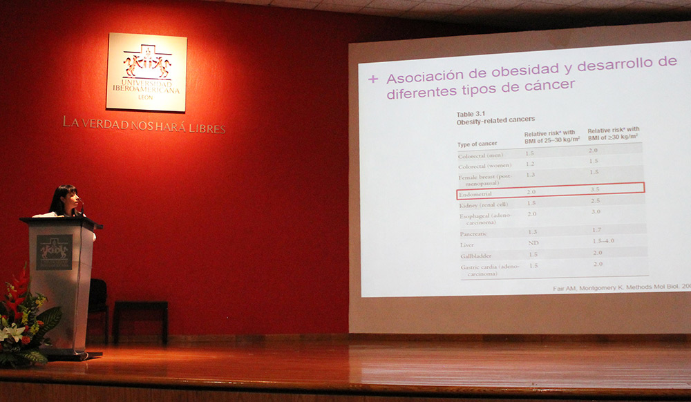 Karla Paola Sánchez Lara, Doctora en Epidemiología, quien ha realizado estudios en el Instituto Nacional de Cancerología, expuso ante estudiantes y académicos que está demostrado que las personas con obesidad aumentan de un 20 hasta un 50% la probabilidad de tener ciertos tipos de cáncer. Los que más se han asociado son el endometrio, cáncer de mama, de próstata, de hígado, de cáncer renal.