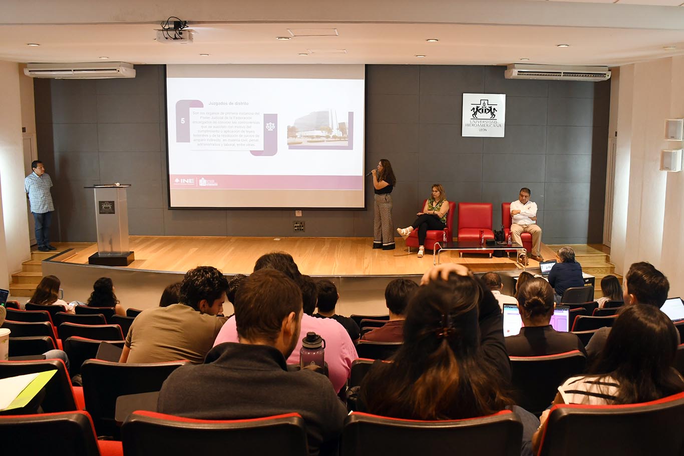 La actividad se desarrolló en el Auditorio San Francisco Xavier S.J. de nuestra Casa de Estudios y fue organizada a través del Centro de Desarrollo Estudiantil. Le acompañaron: Mtra. Araceli Márquez Arciniega, consejera electoral para las elecciones extraordinarias del Poder Judicial de la Federación del 06 Distrito de Guanajuato; y el Mtro. Francisco Javier González Soto, vocal del Registro Federal de Electores del INE, en la 06 Junta Distrital Ejecutiva con sede en León.
