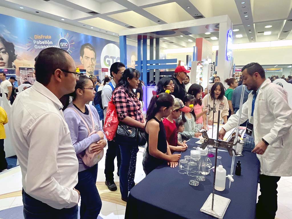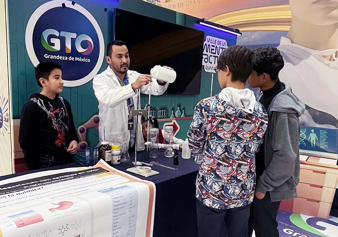 El Dr. José de Jesús Ibarra Sánchez presentó una demostración de síntesis de nanomateriales con reacciones químicas de cambio de color en el stand de Idea Gto ante alrededor de 50 niños y niñas, quienes mostraron interés por aprender de la ciencia.