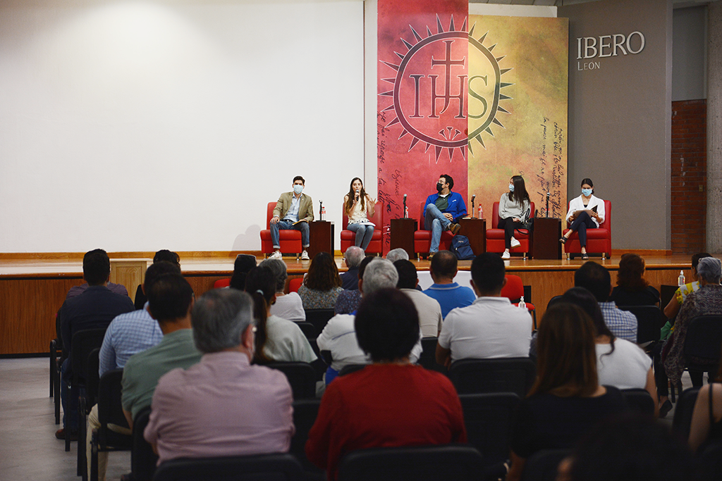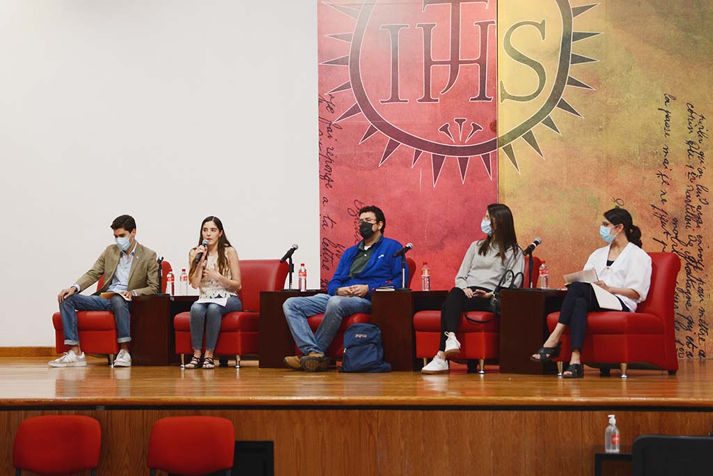 En el panel participaron: Nayelli Michelle Cueva Ibarra, alumna de la licenciatura en Psicología; Luis Gabriel Salinas Rodríguez, estudiante de la licenciatura en Derecho; Sarah Pernet Díaz-Infante, egresada de la licenciatura en Relaciones Internacionales; y el Mtro. Mario Alejandro Montemayor González S.J., responsable de Pastoral Universitaria.