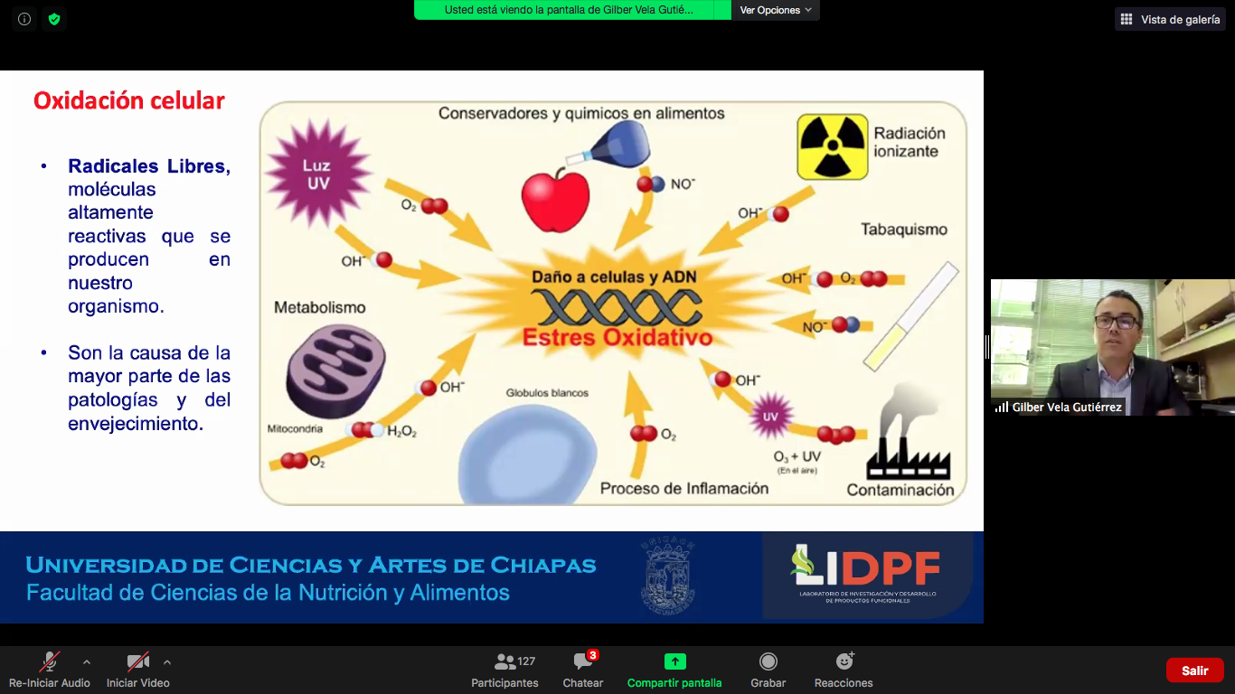 La conferencia inaugural "El papel de los alimentos en la enfermedad COVID 19”, fue impartida por el Dr. Gilbert Vela Gutiérrez, director de la Facultad de Ciencias de la Nutrición y Alimentos en la Universidad de Ciencias y Artes de Chiapas.