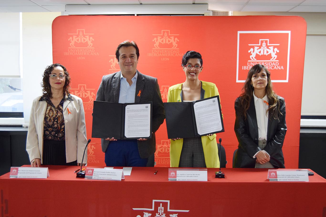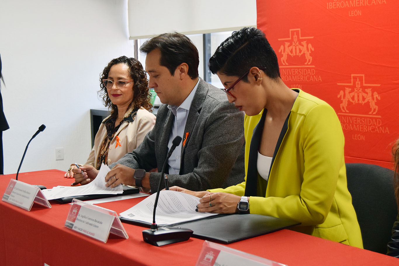 La suscripción del convenio se realizó en esta casa de estudios en la sala Ignacio Ellacuría S.J. La presidieron, por parte de Cultivando Género, la directora Lic. Angélica Contreras Ruvalcaba; y, de la Ibero León, el director general de Administración y Finanzas, Dr. Luis Fernando Padilla Jiménez.