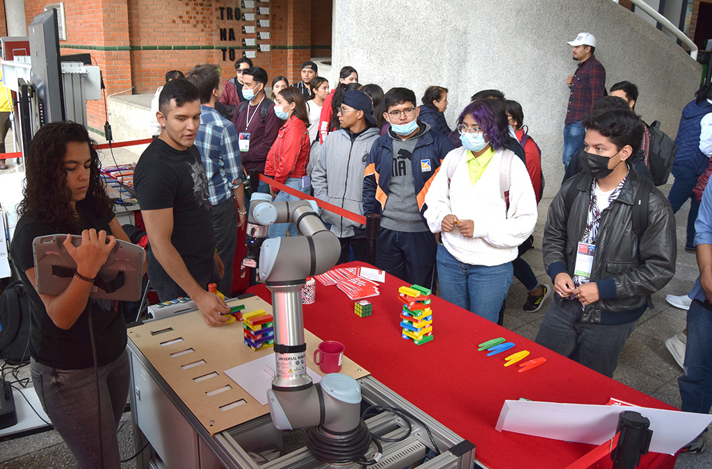 Mostraron también un robot colaborativo, programado para competir con visitantes en el armado de un jenga. “Los alumnos lo que hicieron fue colocar en la tabla, en coordenadas o posiciones específicas cada pieza de jenga, el robot tiene grabado dónde está, y programa colocar, regresar, rotar muñeca, rotar cada una de las articulaciones para armar el jenga; los universitarios lo programaron a través de la plataforma del robot que aprenden a utilizar en el noveno semestre de la licenciatura”, explicó el doctor González Valdez.
